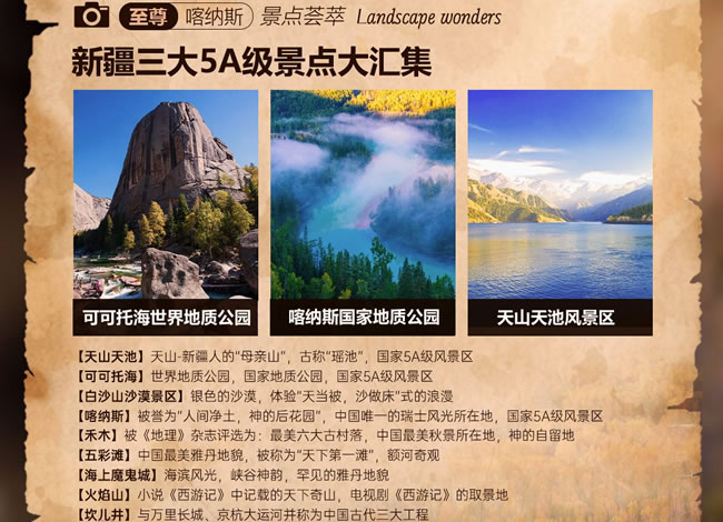 【白沙山沙漠】(贈送,游覽約1小時)白沙山意為銀色的沙漠,只有460米高,高度上在帕米爾高原上確實比較弱,但白沙山長度卻綿延1200米,每當(dāng)有勁風(fēng)吹來,白沙山都會發(fā)出響聲,故而又被稱作“響沙山”。與白沙山緊鄰的兩個湖泊,水草豐美,水鳥聚集,為這座白色的山峰平添了幾分清新活力。從遠(yuǎn)處望去,在遠(yuǎn)方的青山和近處綠草的映襯下,白沙山有的像埃及的金字塔,有的像棱角分明的歐式建筑,還有的像一條銀色巨龍靜臥在碧波蕩漾的大海上。銀色的細(xì)沙潔白柔和,像嬰兒的肌膚,令人心動,不忍下足。獨家贈送【全地形沖浪車激情體驗】(專業(yè)車手駕駛 贈送項目自愿放棄,不做任何退費)隨著車速的增加,沖浪車猶如一艘勇敢的船只,在沙丘之間往返穿梭,留下一道道深深淺淺的車轍,沙丘在車輪下迅速閃過,仿佛一朵朵巨大的浪花在沙漠中翻滾,翻越陡峭的沙丘,穿越沙漠中的障礙 ,給人帶來前所未有的刺激和樂趣,以及征服自然的成就感;【喀納斯景區(qū)】(含門票+區(qū)間車,游覽時間約2小時)國家AAAAA級旅游景區(qū),位于新疆維吾爾自治區(qū)阿勒泰地區(qū)布爾津縣北部,有駝頸灣、變色湖、臥龍灣、月亮灣、神仙灣等主要景點;電影[天地英雄]、劉若英-[分開旅行][原來你也在這里]的取景地;【圖瓦人探秘】(贈送,游覽約1小時)進入圖瓦人家木屋,圍坐在一起,品嘗香醇的奶酒、奶酪、民族點心,聆聽圖瓦人特有的民族樂器-蘇爾演奏,婉轉(zhuǎn)的曲調(diào),悠遠(yuǎn)悠長,恍若隔世,伴隨原汁原味的音樂欣賞蒙古族圖瓦人的磅礴舞姿,豪放有力,不禁讓人潸然淚下。